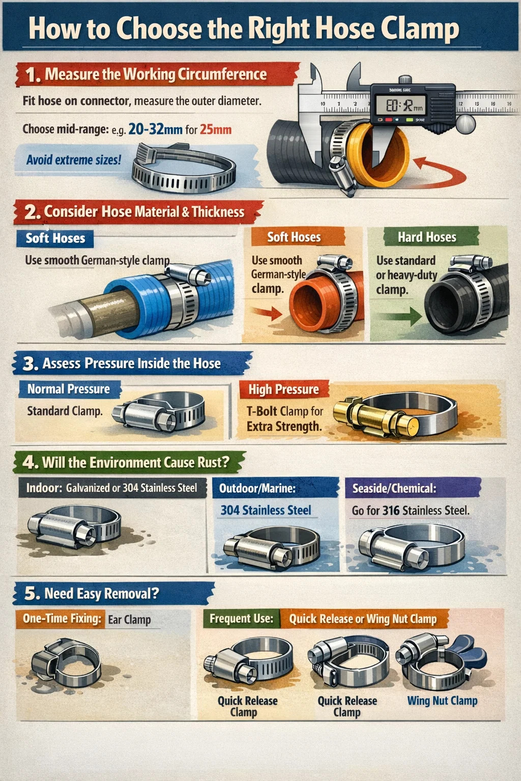 Choosing a hose clamp seems simple enough; you might think you can just grab any one that fits. But in reality, there are many pitfalls. People often buy clamps that are either too loose (even when tightened all the way) or too tight, damaging the hose, or even rusting and breaking over time.