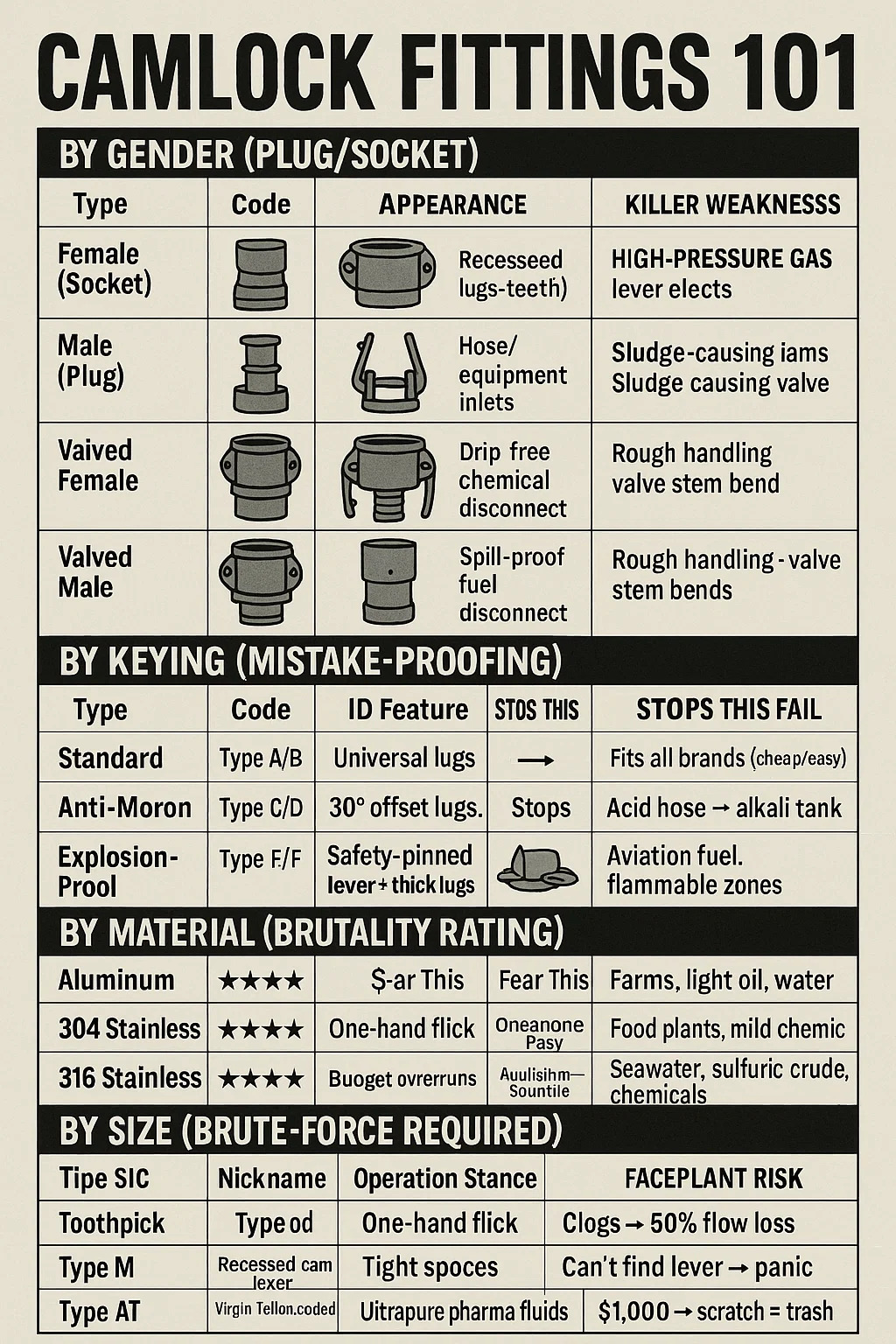 Here's a street-smart breakdown of camlock fitting types – the way riggers and pipefitters actually use them on-site:
