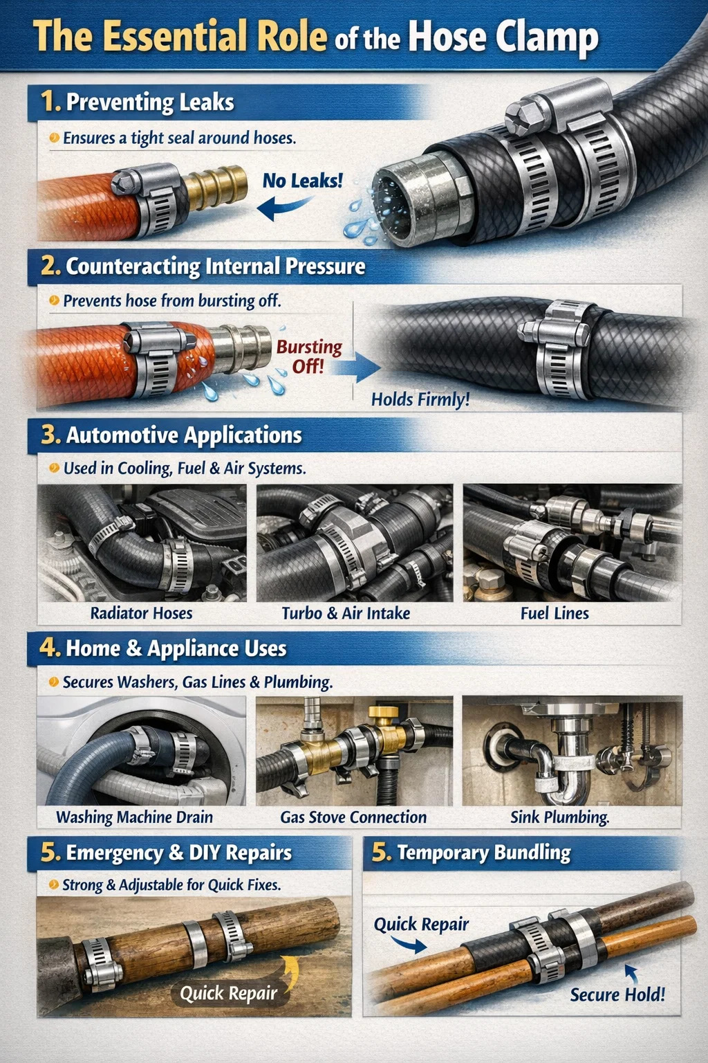 This is where the hose clamp acts as an "anchor." It clamps the hose, holding it firmly against the barbs or protrusions of the fitting, ensuring that the hose remains in place regardless of the internal pressure.