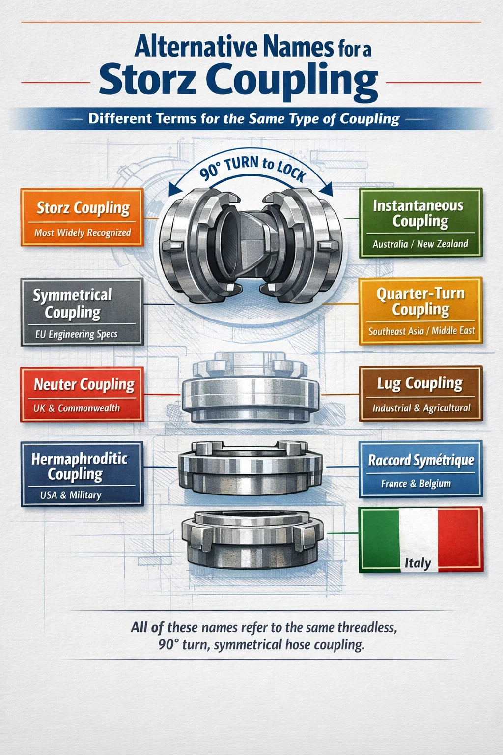 Understanding which term is used in a given country or industry matters practically, not just academically. A procurement officer searching for "neuter coupling" in a European industrial catalogue and a fire equipment buyer searching for "Storz coupling" in an Australian supplier database are looking for exactly the same product. Getting the terminology wrong can result in missed search results, specification mismatches, or unnecessary adapter procurement. The sections below break down every significant alias, where it originates, and when you are likely to encounter it.
