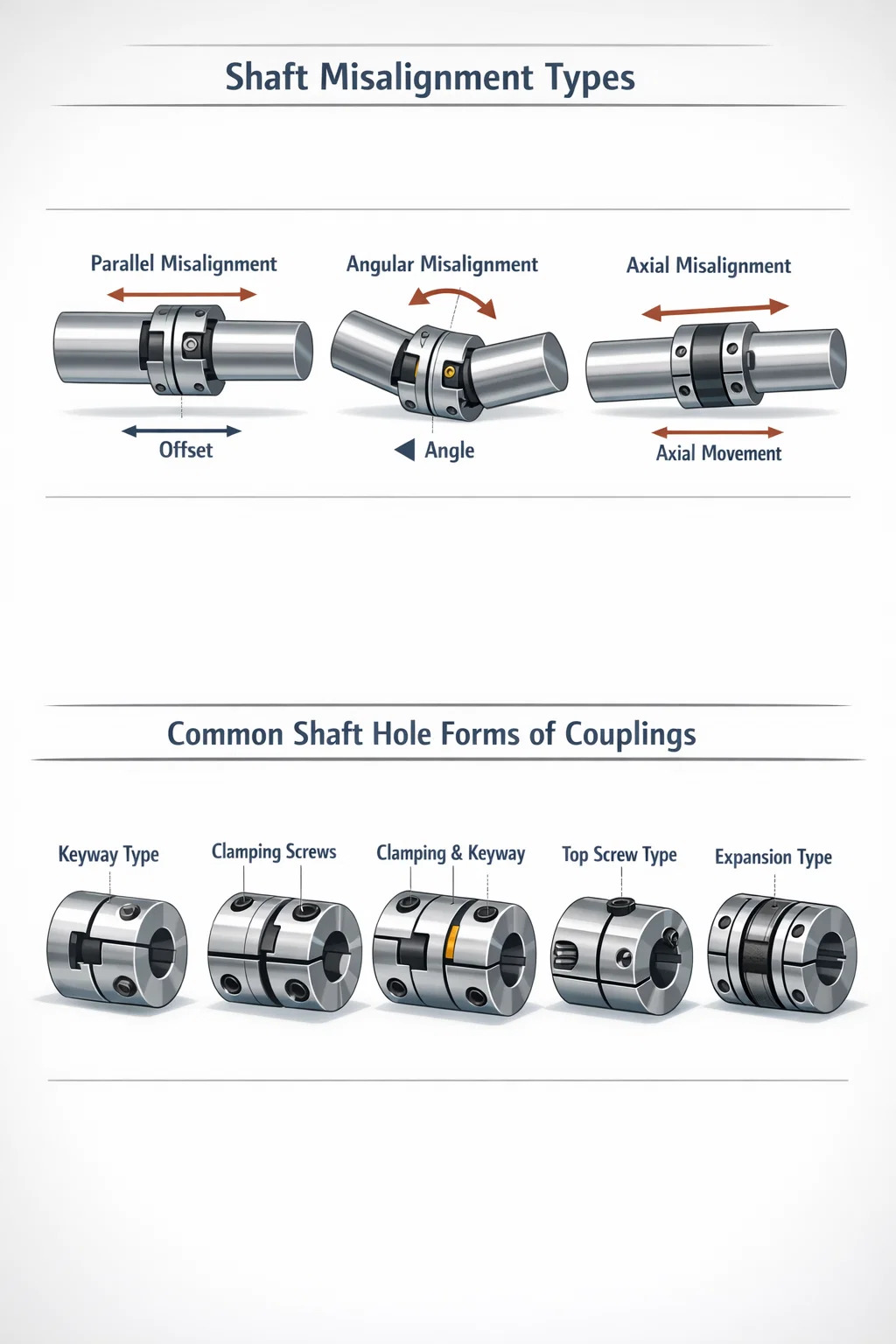 The greater the flexibility, the stronger the ability to absorb deviations; the smaller the flexibility, the weaker the ability to absorb deviations. Generally speaking, this shaft-to-shaft deviation is divided into the following three aspects: The connection between the coupling and the peripheral equipment is realized by inserting the shaft of the equipment into the shaft hole of the coupling. The shaft hole forms of the coupling generally include keyway type, clamping type, clamping + keyway, top wire type, expansion type, etc. The keyway type is the most widely used, suitable for ordinary motors, ordinary reducers and ordinary transmission shafts. The clamping type is more widely used in servo motors, stepping motors, and various synchronous transmission shafts. The shaft and the hole are closely matched without any transmission gap. If an additional keyway structure is added, the torque transmission capacity can be enhanced. The top screw type is suitable for small shaft diameter and small torque transmission occasions, such as micro motors, encoders, etc.
